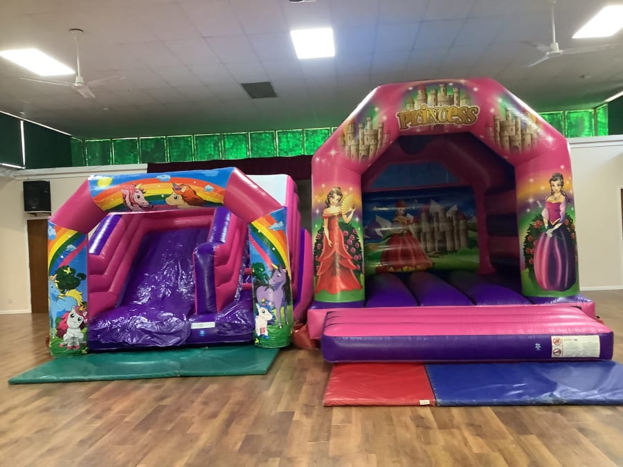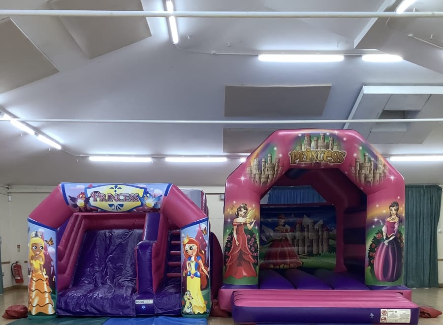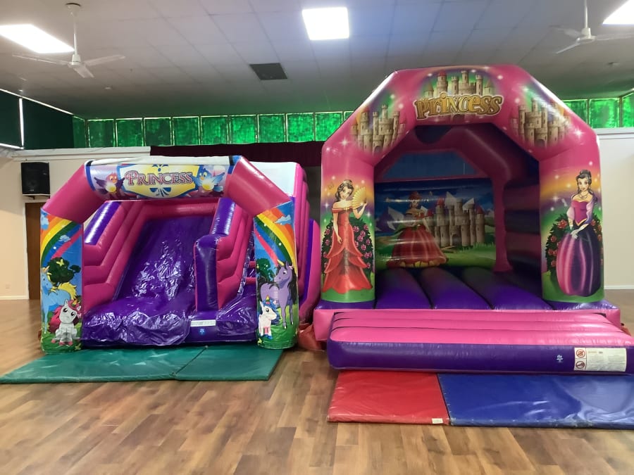 Princess Party Package. This package includes a delightful princess bouncy castle and a separate princess slide, perfect for creating an enchanting atmosphere.