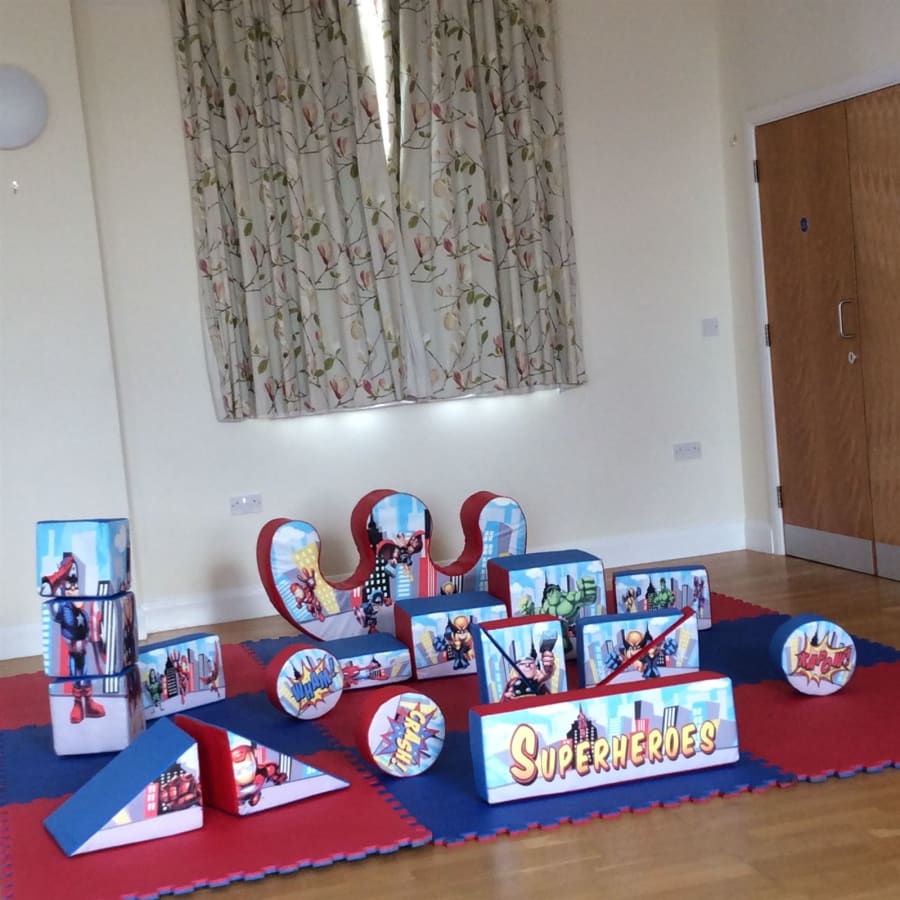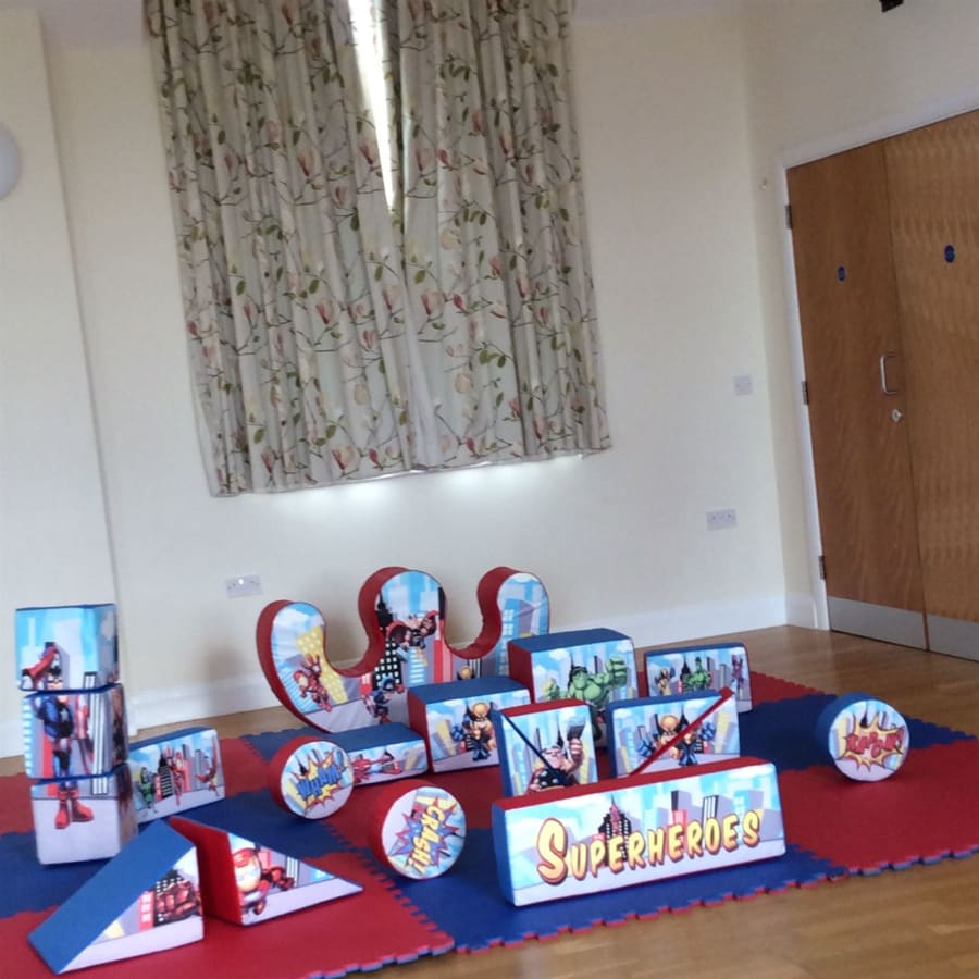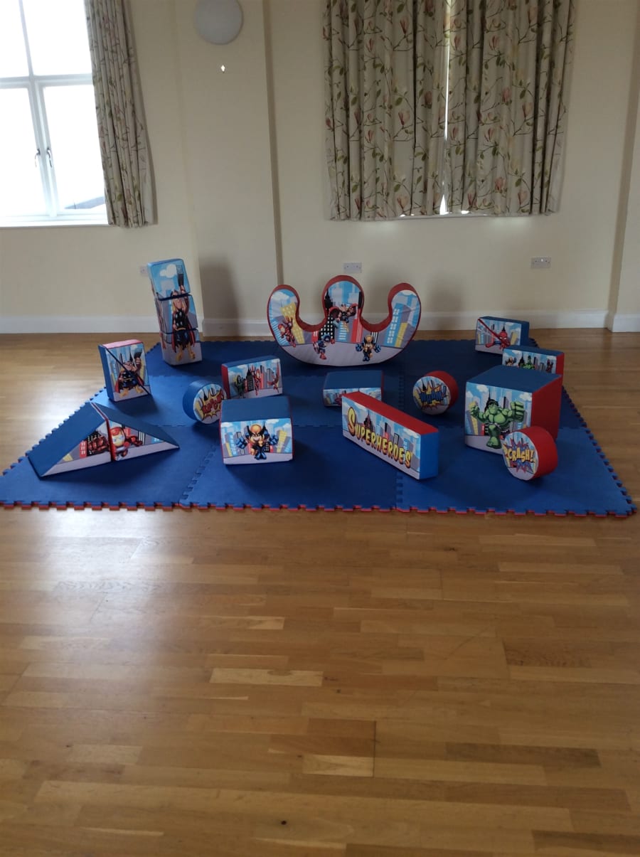 Mini Super Hero's Soft Play Set. Perfect for hero-themed celebrations, this 18-piece set includes a variety of exciting shapes and a super hero double soft play rocker designed to capture the imagination of young adventurers.